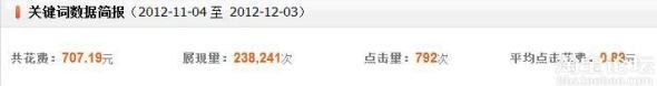 B、開起直通車。直通車讓許多賣家又愛又恨,小學生也是一樣的感覺,開嘛,本來訂單跟利潤又不大,開了鐵定坑爹,虧本!不開嘛,又沒有流量,買家在漫漫商品海中無法關注你!痛定思痛之下,還是開起了!剛開的第一天,因為設置不當,一個小時一百塊就燒沒了,一單也沒有成交,大呼坑爹,傷不起啊!后來玩命的論壇找帖子學習,最終定下了廣撒網,撈小魚的直通車策略:即全店鋪所有產品投滿200個關鍵詞,所有關鍵詞出價都很低,這樣你在花費不大的前提下,也能獲得不錯的流量,下面是我這一個月的直通車花費圖,點擊量雖然不高,但是轉化率不錯,點擊進來的肯買,一個可能是我的產品定價跟定位不錯,另一個也可能是買家翻到后面了,懶得再找