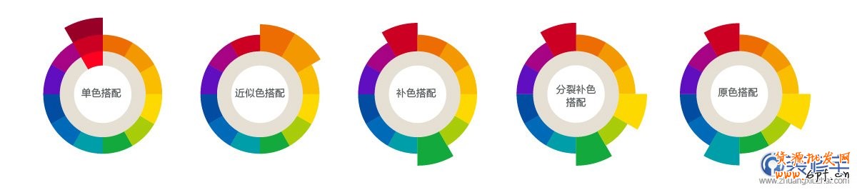 常見的搭配方式有單色搭配,近似色搭配,補色搭配,分裂補色搭配,原色搭配。如下圖。