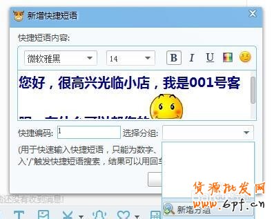 第三、選擇“新建”添加短語,字體顏色按自己喜歡設(shè)置,“快捷編碼”自己隨意設(shè)置,添加分組“常用語”最后點(diǎn)擊保存,右欄就看見您的快捷短語了!使用時,用鼠標(biāo)直接,點(diǎn)擊快捷短語,就自動,添加到輸入欄了,直接發(fā)送就好了。注:最好是先提前在聊天欄編輯好了再添加,不然在快捷短語里直接編輯,會看不到那么全面,自己編寫好直接添加,我個人認(rèn)為會更好一些!