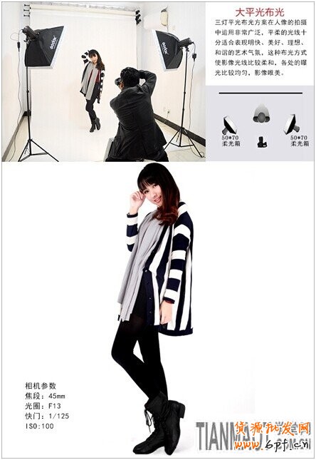 大平光布光在人像的拍攝中極為廣泛,這種布光方式使影像光線較為柔和,均勻,影像唯美。