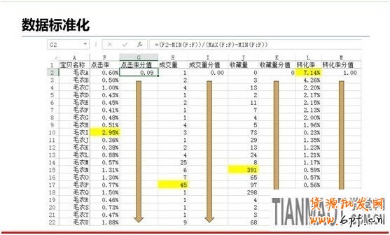 若我們將毛衣A的點擊率、成交量、收藏量和轉化率相加,只會得到一個錯誤的結果,因為每個維度的數值單位不同,是不能相加的。所以我們必須找到一個科學的計算方法,就是“多變量綜合評價法”。利用統計學當中經常使用的“多變量綜合評價法”來對毛衣A的多個維度數據進行標準化。公式如下。