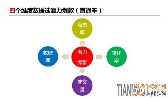 一般看某款寶貝是否有潛力,可以從點擊率、轉化率、收藏量和成交量四個維度的數據進行綜合考量。這些數據可以從店鋪正在進行的直通車推廣中得到。