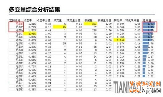 當報表下載后,掌柜不用借助過多復雜的軟件工具進行分析,只需使用EXCEL即可。首先在報表中找到四個數據維度,分別對應的最大值,我們會發現,轉化率高的寶貝,對應的點擊率、成交量和收藏量卻相對較低;而點擊率高的寶貝,對應的成交量、收藏量和轉化率也并不是很理想。所以從這里我們可以看出,按單一維度數據選款是不合理的。