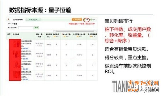 第二個是量子恒道。在量子恒道中,有一項“寶貝被訪排行”的功能,我們可以在這里獲取需要的數據。對于剛上架不久且零銷量的寶貝,建議選取的數據維度:PV、UV、平均停留時間,這些數據維度都是“往上走”的,帶有降序性質;最后還要單獨分析寶貝的跳失率。如果某款寶貝的總分值較低,而跳失率得分較高,說明這款寶貝的內頁需要進行重點優化。