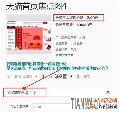 如果您想流量來自定向,那么千次展現價格建議設置到該展位的最低,如說淘寶首焦的最低千次展現價格是7元,我們就出價7元,降低被通投的幾率 。
