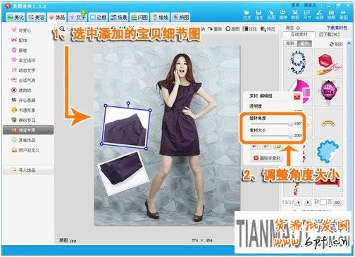 第二步:對添加進來的細節圖,需要根據自己的實際情況,適當調整大小、角度和位置,甚至透明度。只要選中需要編輯的寶貝,就可以自由設計了。