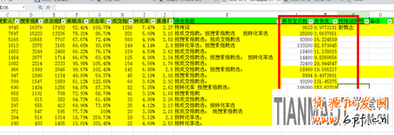 競爭度這一欄用當前寶貝數/搜索人氣,下拉填充,整個數據準備工作完成,標題關鍵詞一目了然(如下):