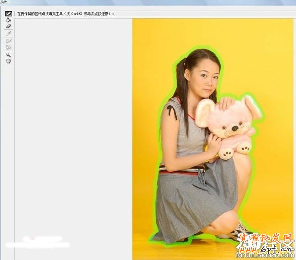 2.在photoshop中點(diǎn)[濾鏡][抽出],出現(xiàn)[抽出]對(duì)話框,此時(shí),按住鼠標(biāo)左鍵在人物邊緣繪制出一條綠色的線條,在繪制的時(shí)候注意畫筆大小,可以移動(dòng)滑塊調(diào)整大小,這樣,圍繞人物和背景邊緣處的線條繪制完畢,是閉合的哦。如圖: