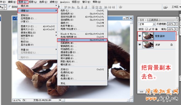 3、執行:圖像——調整——去色。把復制出的背景副本變成黑白。