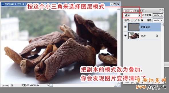 5、將此圖層的混合模式改為疊加,你會發現圖片變得清晰一些了。