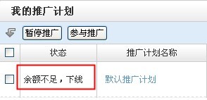 首先,請您進入直通車后臺確認推廣計劃的狀態,正常應該是“推廣中“;若計劃狀態為“暫停”、“余額不足”或“不在投放時間內”,則直通車上也會找不到您的寶貝;如圖所示: