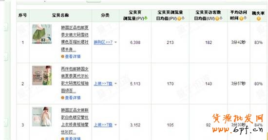從圖上可以看出,上面兩個主推的款式,跳失率都達到了80%以上,說明有80%的流量都浪費掉了。這說明了直通車流量還不夠精準,同時,詳情頁面也做的不夠好。