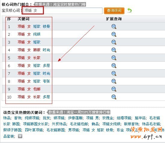 舉例:點(diǎn)擊第一組關(guān)鍵熱詞“項(xiàng)鏈 女”后擴(kuò)展查詢到下面的此表,可以得到細(xì)化一些的關(guān)鍵詞。
