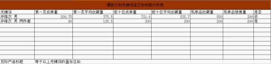 這個大家相信多是很懂的,就不用我多說了,相信派代里面有一大堆關于這類高手的文章,我這邊只是用表格進行了統一化的管理,其實意思很簡單,說白了就是按照當前銷售把關鍵詞分層幾個階段,比如:200單銷售額 500收藏,這樣的記錄已經能匹配到如:沖鋒衣 男 兩件套這樣的關鍵詞的第一頁了,結果你不知道所有沒做,那你就吃虧了。
