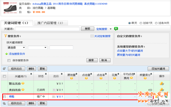 當(dāng)一款寶貝的總體點擊率很高,里面的所有關(guān)鍵詞質(zhì)量得分都很高。我用的方法是利用關(guān)鍵詞的點擊率,提升定向的質(zhì)量得分。下面看圖: