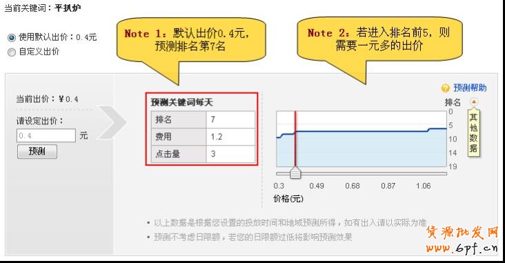 6、在右側展示位靠下方的 當合理出價的排名只能在7、8名,進入排名前5需要出較高價格時,我們沒有必要去拼,我 們可以把展示位適當調到下方或者第二頁,這些或許也會是不錯的位置哦。 例如同樣是“平扒爐”這個關鍵詞,默認出價是0.4元,排名是第7名;而我們自定義價 0.12元,排名是第10名,位置更好哦。