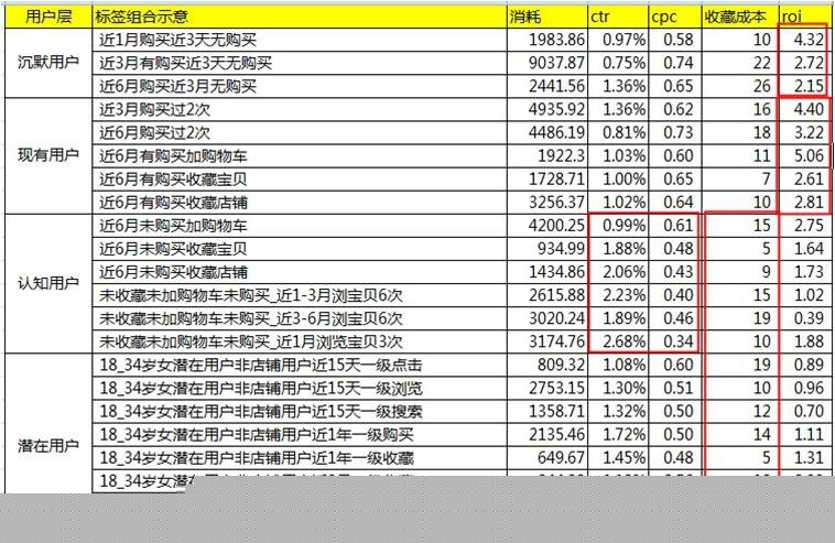 以上是一位掌柜DMP定向投放數據匯總,需要從CTR、CPC、收藏成本和投入產出比來衡量各種人群標簽組合效果。認知用戶點擊率最高,點擊成本最低一些;而認知用戶和潛在用戶收藏成本低,重點做收藏數;但最終的投入產出比又是沉默用戶和現有用戶高,更高的銷量是通過這兩層用戶去創造的。