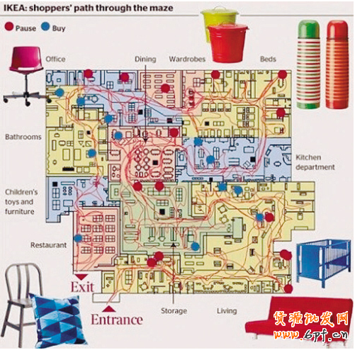 關于這個不得不說的聯系說到宜家的門店布置圖。他們設計通常是一條強制的單行線,消費者必須穿越幾乎整間賣場所有的區域才能到收銀臺,這種設計的有點在于能夠讓消費者接觸到他們可能原先并沒有想要尋找的商品。弊端是,對于目的性非常強的消費者,這樣的路線會造成很多的不便。而作為店鋪的掌柜,我們需要有這樣的一個思路,去引導消費者瀏覽店鋪所有的寶貝,從而增加訪問深度降低跳失率。至于具體是連衣裙專區過了以后是活動專區,還是上衣專區或者是促銷包郵專區,還得自己去摸索了。