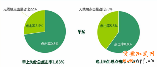 大家應該都知道無線端吧,無線端被炒得很熱,現(xiàn)在無線端的直通車點擊變得越來越多。你可以想象一下,在一天24小時之內哪個時間段無線端的點擊數(shù)量占比是最高的?沒有人早上或者下午上班的時候在那一個個寶貝去看,然后去下單什么的,很少對吧。到了晚上的時候他就開始了,他就拿著手機,拿著平板就開始逛淘寶了,所以這個時間它的占比是顯著的要提高的。可能上午九點無線端占比是22%,到晚上9點就變成了35%了。那另外一個事情是無線端的點擊率比電腦端PC端正常的點擊率要高5到8倍,這個是因為我看了眾多直通車的數(shù)據得出來的一個結論,一般是5到8倍這樣,當然也有更高的更低的,那意味著是什么?