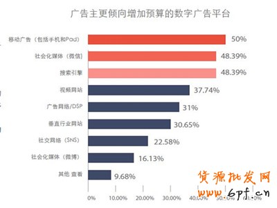 此外,搜索引擎、視頻網站、微博分列2-4位,移動廣告憑借41.94%列在第五位。對于企業主來說,數字平臺的百花齊放可以讓他們以最優的組合方式在數字媒體進行廣告投放。
