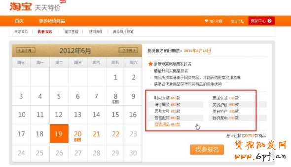 答:目前天天特價報名時間段為7-10天的活動,例如2012年6月12日點擊我要報名,則可選擇的報名時間段為6月19日——6月22日任一天的活動,選擇好活動日期后,如果審核通過,則按照選擇的日期上線。商家可以根據每天實時報名的數據提示,有技巧地選擇活動日期進行報名。一期還沒有上線日歷選擇功能,每日報名商家數據統計請移步:http://bbs.taobao.com/catalog/thread/15283510-257201944.htm