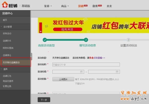 2、進入活動中心后,點擊“天天特價店鋪活動”或“店鋪清倉”即可創建活動。