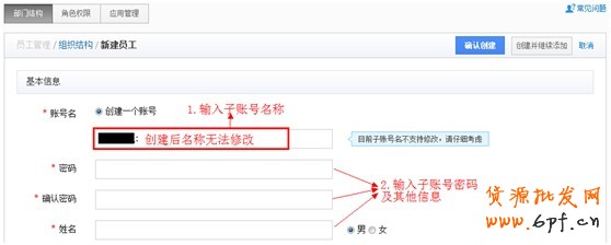 如圖7,在菜單員工管理>部門結(jié)構(gòu)下點(diǎn)擊新建員工,按照圖8提示將員工和子賬號信息錄入即可。