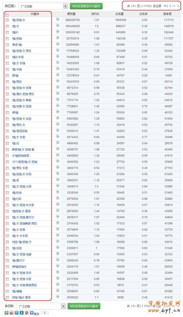 搜索結果,總共有5頁,共計1733條匹配詞記錄。看看是不是都與寶貝相關度極高啊。這一簡單操作,免除了你頻繁去用excel表,篩選關鍵詞,而且是否與該寶貝匹配吻合,則又是很大一個問題。用這個工具網站,就這么簡單操作。