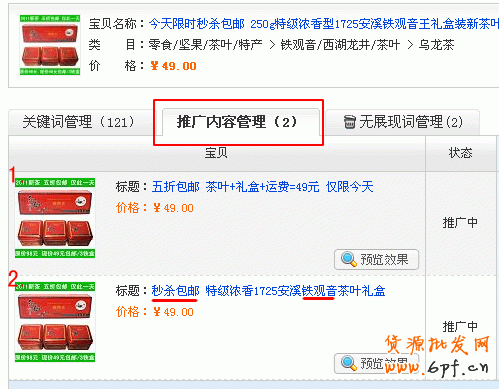 進入推廣寶貝頁面,就可以看到推廣內容管理,點擊進去就可以編輯,一定要設置好兩個推廣標題,標題一定要簡潔明了,突出重點。舉例:圖2的關鍵詞:“鐵觀音 秒殺 包郵”,都在上圖標題2(畫紅線處)出現(xiàn),所以它的關鍵詞相關性就是好。