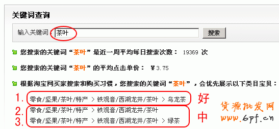我們以“茶葉”為例總共出現(xiàn)3個類目,那么第一個類目才是好的類目,第2.3個類目相關性就是中,各位掌柜請按照個人的寶貝選擇合適類目放置,關鍵詞查詢頁面只是提供一個參考。
