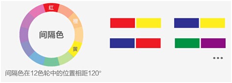 根據(jù)“紅橙黃綠藍(lán)紫”六字順序,紅+黃 ,橙+綠 ,黃+藍(lán) ,綠+紫 ,藍(lán)+紅,這種搭配方式中間都隔了一個(gè)顏色,因此稱為間隔色。