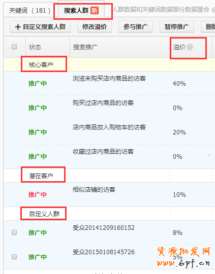 【搜索人群】針對了三大人群進行溢價投放,分別是:核心客戶、潛在客戶、自定義人群