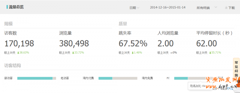 3、免費流量及付費流量分析,當店鋪的付費流量出現上升的時候,占比加大,而免費流量是沒有隨之上升的時候,店鋪的付費流量投入成本將加大,而且店鋪的利潤率也會因此開始受到影響。這時,就需要及時針對占比大而提升空間較大的免費流量渠道進行完善優化,盡量避免店鋪流量的失衡。