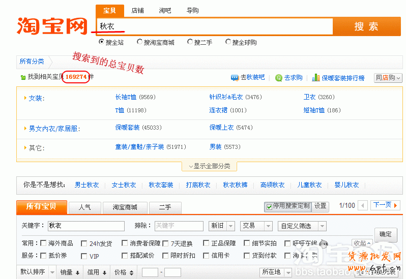 舉例我們搜索“秋衣”這個關鍵詞,總共搜索到169274件寶貝,如果您不是大賣家,寶貝又不是快下架的情況下,那么您被買家搜索到的幾率幾乎為零,如下圖