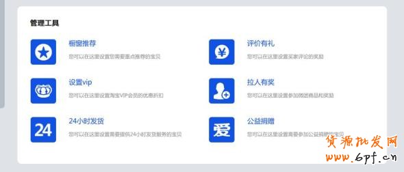 原有的櫥窗推薦、VIP設(shè)置、愛心捐贈、回收站、歷史寶貝、評價有禮、拉人有獎、24小時發(fā)貨、體檢中心等功能現(xiàn)在全部作為單獨的功能組件提供服務(wù),可以在寶貝管理首頁找到入口。