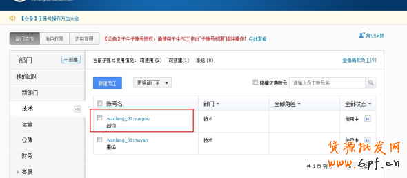 一、進入子賬號管理后臺,點擊您所需要授權的子賬號,例如:要授予“越鉤”,就勾選越鉤的名字就可以了
