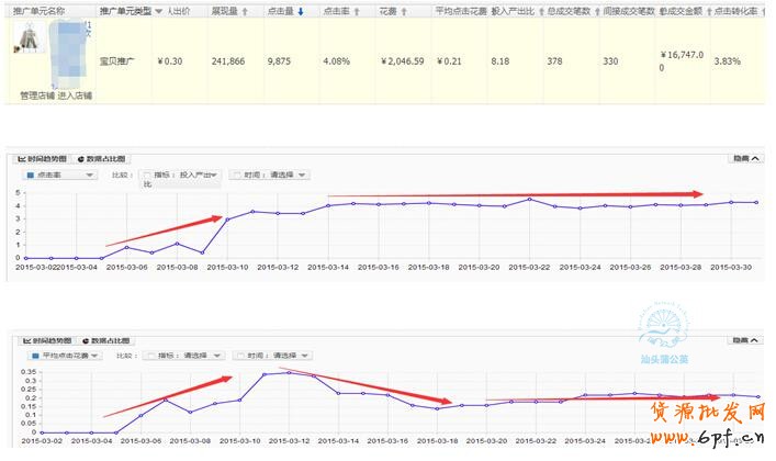直通車的roi高達(dá)5.43,成交筆數(shù)為3880筆,ppc為0.13元!而這個數(shù)據(jù)其實還是有成長空間的,不信,請看下面的趨勢圖:
