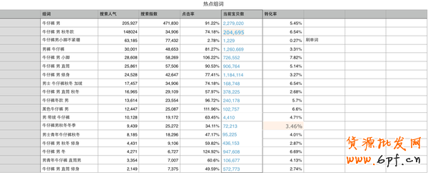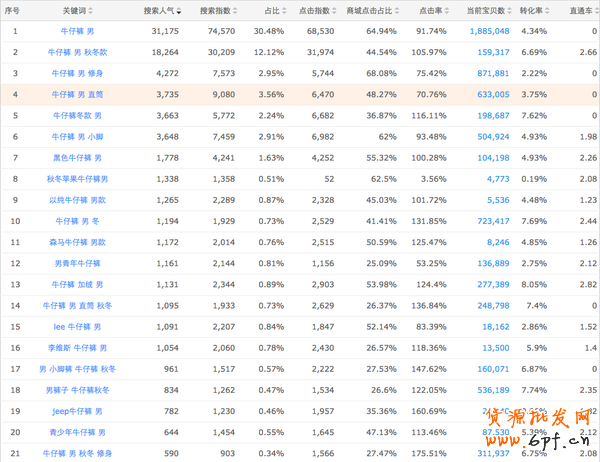 寶貝標題我一般是在數據魔方找詞,當然其他地方也可以找,我一個一個的說。為什么要數據魔方呢,因為數據魔方的更新率非常快能很好的跟上市場的節奏。比如說我要找的這個詞是男裝牛仔褲,那么就直接搜“牛仔褲男”。 我一般只要排名前50的,然后進行篩選,做一個搜索關鍵字的詞根表。