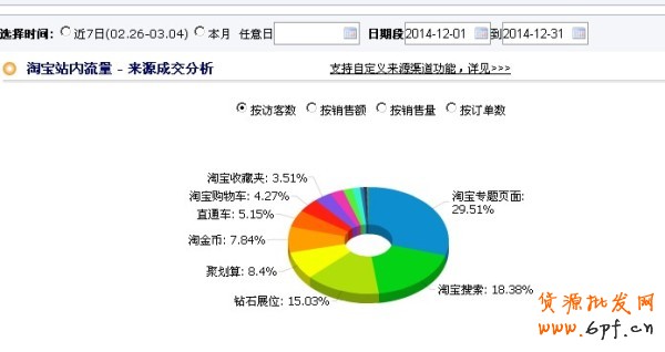 從上圖,我們可以大致的看出整體店鋪的流量結構。從12月份的流量結構來看,店鋪的免費流量并不是很高,尤其是自然搜索流量更低,并且免費流量大部分來源于淘寶專題頁面,聚劃算的流量占比也是相當高,可以說,整體的流量結構并不是很健康。