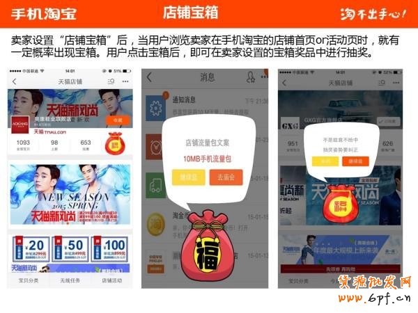 店鋪寶箱是今年淘寶無線端重點打造的互動工具,賣家設置“店鋪寶箱”后,當用戶瀏覽賣家的無線店鋪首頁or活動頁時,就有一定概率出現寶箱。用戶點擊寶箱后,即可在賣家設置的寶箱獎品中進行抽獎,獎品、中獎幾率、中獎次數等賣家都可以在后臺設置。
