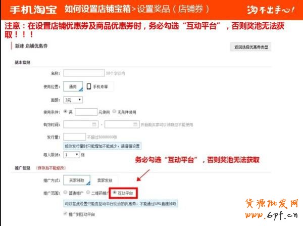 獎品如果是店鋪優惠券或者商品優惠券,都需要到營銷平臺設置新的券,且在設置券的時候,必須勾選“互動平臺”,否則獎池無法獲取;獎品如果是店鋪優惠券或者商品優惠券,都需要到營銷平臺設置新的券,且在設置券的時候,必須勾選“互動平臺”,否則獎池無法獲取。