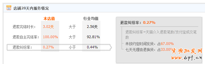 上圖為店鋪內近28天的服務情況,主要包括退款的相關服務情況,當前主要問題的退款處理的時間過程,從買家發起申請退款,到最終退款成功的時候需要耗時3.02天,而行業的平均水平是2.56天,高于行業水平,建議后續是盡可能提高處理的時效性,盡可能快速處理。同時需要注意避免產生退款糾紛,產生問題盡可能和買家協商處理。