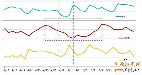 3) 長假過后pv、cpm和ROI都穩定回升,特別是cpm的上升的一個不可逆轉的趨勢;在4月25日-5月10日這半個月的“cpm凹槽(紅框內)”是商家們可以好好利用的時間。
