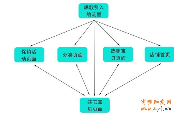 對于爆款帶來的流量,一定要好好把握住,關聯你的店鋪中的其它寶貝,盡可能讓客戶看到你店鋪中的其它頁面,比如:促銷頁面丶分類頁面丶首頁等,讓客戶在你店鋪中的訪問路徑形成一個閉合回路,看下面的圖: