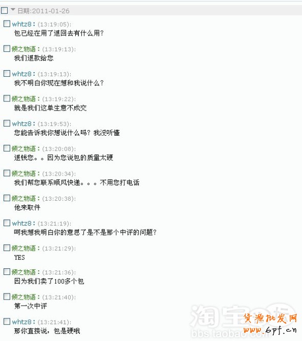 相信大家都清楚,1月17號收到貨,今天1月26號了,期間每天此旺旺最少在線10小時,淘寶可以查詢,沒有和我溝通過1句,也沒作出任何評價,今天1月26號,明天我就關店回家過年了,直接1個中評。我想請問,如果你是買家,你買到了1個包,你感覺皮質太硬,我送你的香水,碎了1瓶,你是先和我聯系,還是先直接中評。本人態度及其誠懇的對待她,終于。露出了本性,我不要她上傳任何圖片,我直接說我全額退款給您,來回運費我也出,我不用您聯系快遞,我幫您聯系順風,快遞會上門取件,香水碎了是禮品,就不用您退了,您把包退我就可以了。請問,作為賣家,我主動全額退款,主動還承擔運費,還主動幫你聯系快遞,還要我們怎么做。難道要我們幫你舔鞋子嗎?那人看我這么堅決的退款,估計又想要這個包,覺得95元買很值得,就找借口,要我再送1瓶香水就算了,就幫我改評價。試問你們每個人,包真的有問題,賣家全額退款你們不是更好嗎?為什么要1個質量不好的包。所以,我已經上傳到了淘寶,希望給這些人嚴厲的處理,過年了,什么壞心的人都有。