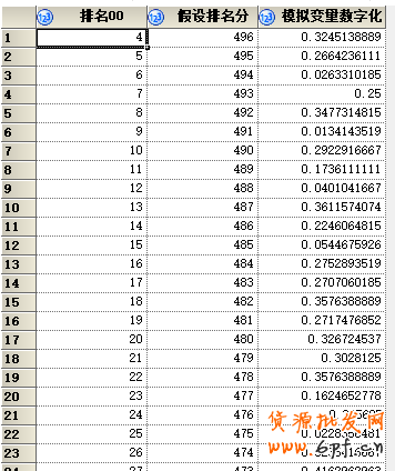 這個就是我剛剛弄好的兩個變量,其中假設(shè)排名分,就是設(shè)的一個根據(jù)排名越高,給分越高的一個設(shè)定,在這個分析中,并沒有什么作用,大家不必去在意。然 后,需要做一個初步判斷,最簡單的方法,就是作圖,直觀,簡單,能看出很多東西。我先做了一個散點圖,看看分布。