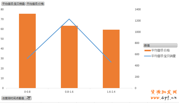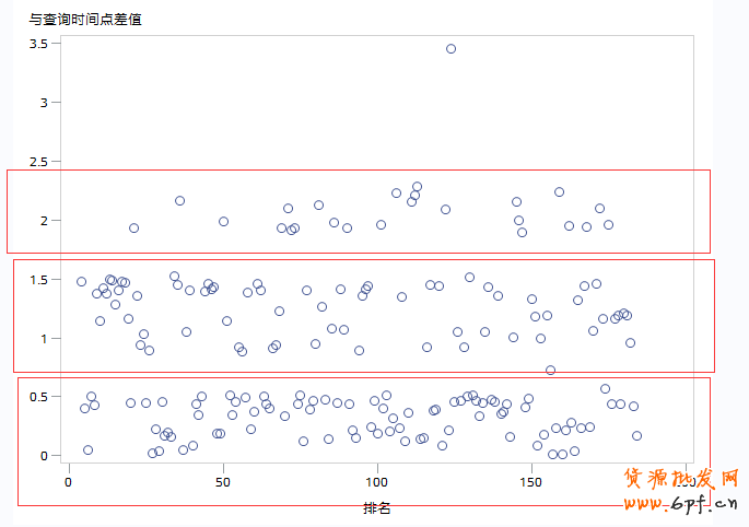 這邊縱坐標的1,已經(jīng)是代表了1天,因為這個詞的寶貝數(shù)比較少,已經(jīng)不能把日期看做一個離群值來考慮了。可以看到,這邊明顯分為3個層級,在一天到一 天半之內(nèi)的時間,也是可以上首頁的,那我們是否也可以考慮,把這三個層級分下,看看具體他們寶貝有什么區(qū)別,也可以作為我們排名靠前該怎么做的一個依據(jù)。
