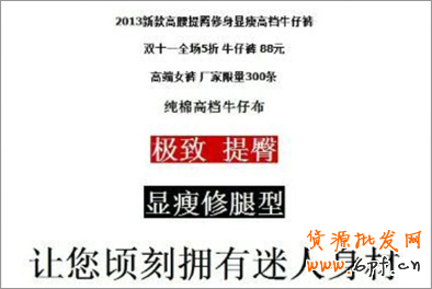 文案寫了”13年新款、折扣、限量“,限量可以勾起買家緊迫感,哪怕一個(gè)買家匆匆忙忙地,不樂意看這些小字,那么看到“極致提臀 顯瘦修腿型”的時(shí)候,你說這些文字對(duì)于買家的腦的刺激,他會(huì)不會(huì)對(duì)件產(chǎn)品的興趣就來了呢?“哇,這個(gè)東西能提臀,還能顯瘦修腿型,那這個(gè)東西很符合我的修 身小腳褲的要求”。”并且能讓您頃刻擁有迷人身材“,這么大的字不用多,簡(jiǎn)單凸顯出來,那么他對(duì)于你的立馬就會(huì)勾引起興趣