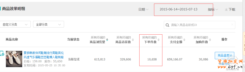 該寶貝為豆豆鞋男款,剛推廣時銷量基礎為63單,推廣時間從6月14推廣到現在7月14,利用直通車無線端引流,帶動店鋪寶貝的自然搜索和成交,隨著無線端流量的增大,現總成交為6000件,時間為一個月。數據如下: