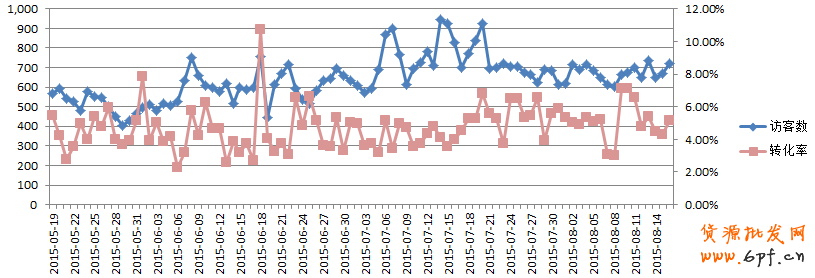 下圖是該產品在使用我們移動營銷頁和挖寶大作戰資源后的無線端訪客數和轉化率趨勢圖,我們可以明顯地觀察到訪客數從500左右提升至700以上;轉化率從3%左右提升至5%左右。移動營銷頁突破淘寶無線端視頻無法播放的劣勢,提升買家體驗滿意度,對無線端轉化率有一定促進作用;挖寶大作戰能讓買家獲取淘金幣、優惠券和ipad等獎品,增加了買家粘性的同時為店鋪帶來更多曝光(獎品池中集合各大商家優惠券資源)。